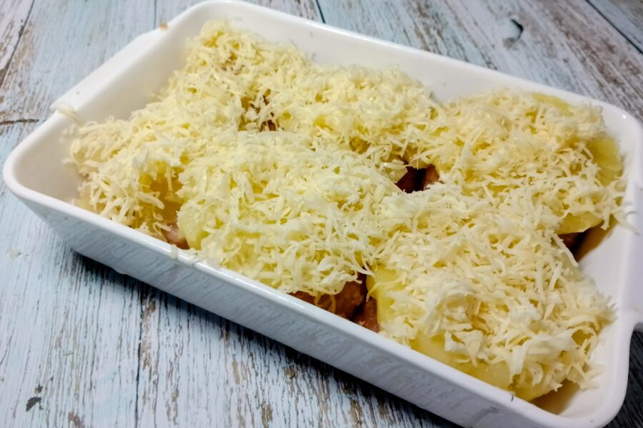 - Espolvorea generosamente queso rallado por encima de la capa de rodajas de piña.