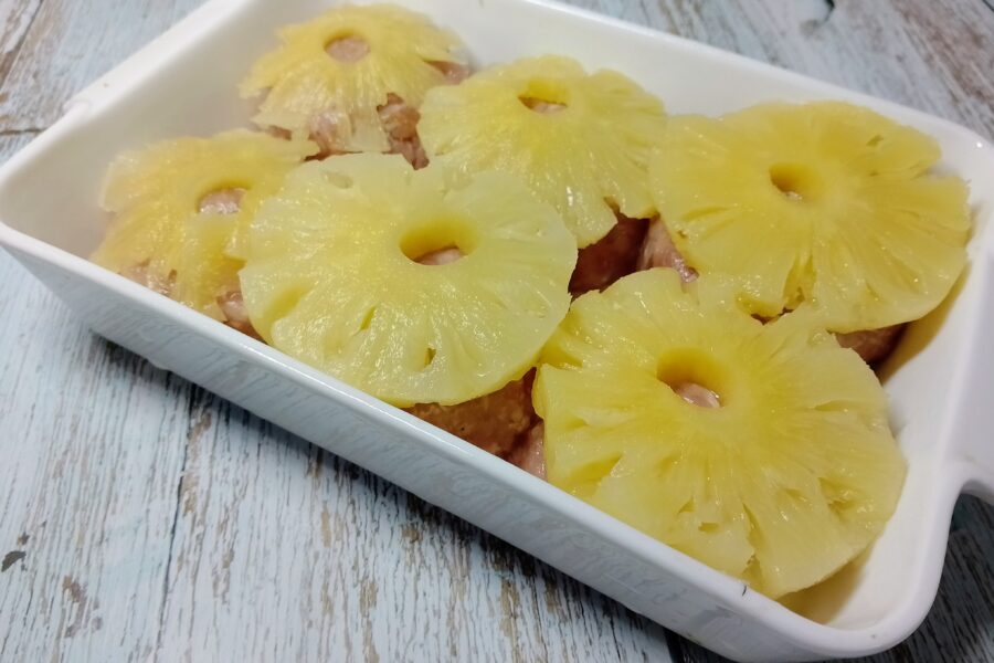 - Coloca una rodaja de piña sobre cada albóndiga.