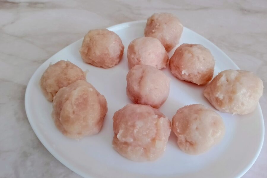 La carne picada de pollo se sazona con sal y especias al gusto y se moldea con las manos ligeramente humedecidas para formar albóndigas pequeñas y regulares, lo que asegura que se cocinen de manera uniforme y queden tiernas por dentro sin resecarse.