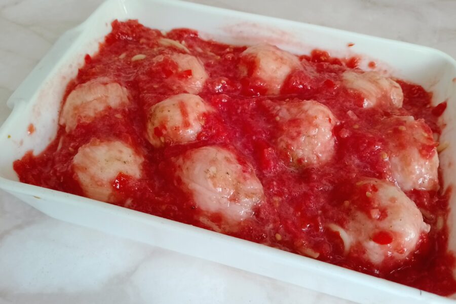 La salsa se prepara escaldando los tomates en agua hirviendo unos segundos para quitarles fácilmente la piel y después triturándolos hasta conseguir un puré fino, obteniendo así una base de tomate fresca y ligera que impregnará la pasta y las albóndigas durante el horneado.
