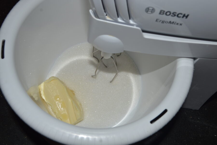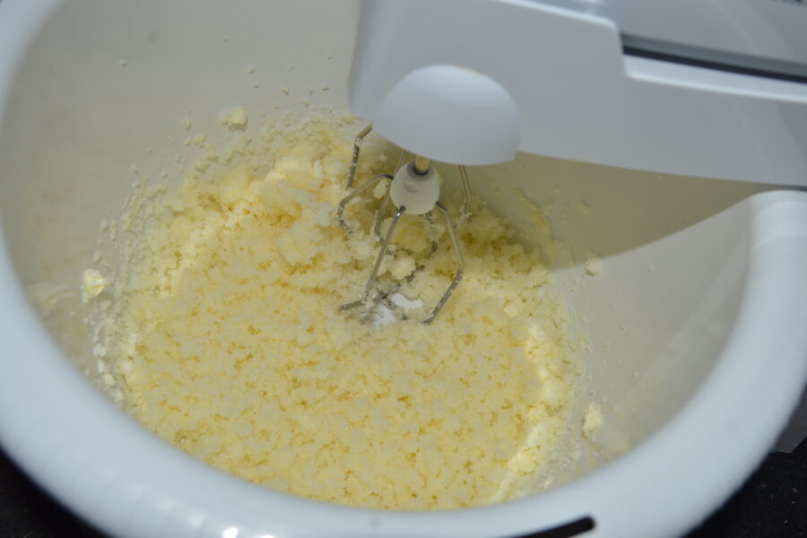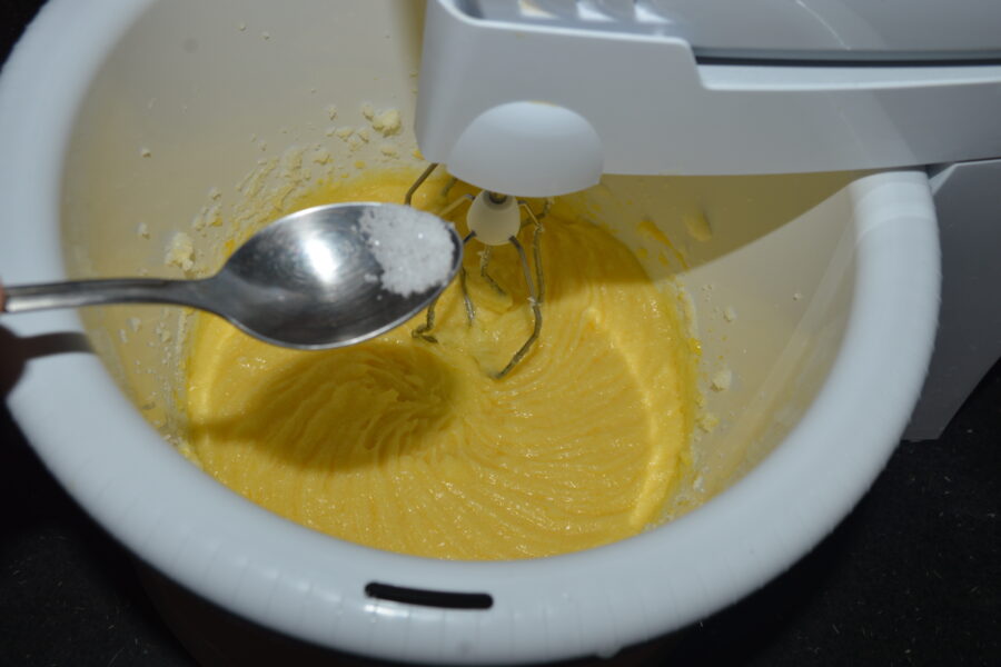 - Añade el huevo y el azúcar vainillado, y sigue batiendo con la batidora.
