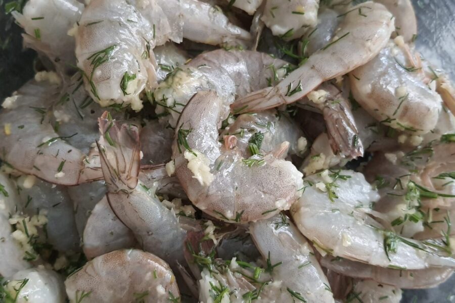 El adobo se hace mezclando el ajo picado con el eneldo y luego repartiéndolo sobre las gambas junto con el aceite de oliva y la sal. No hace falta ningún otro ingrediente para conseguir un resultado aromático y agradable.