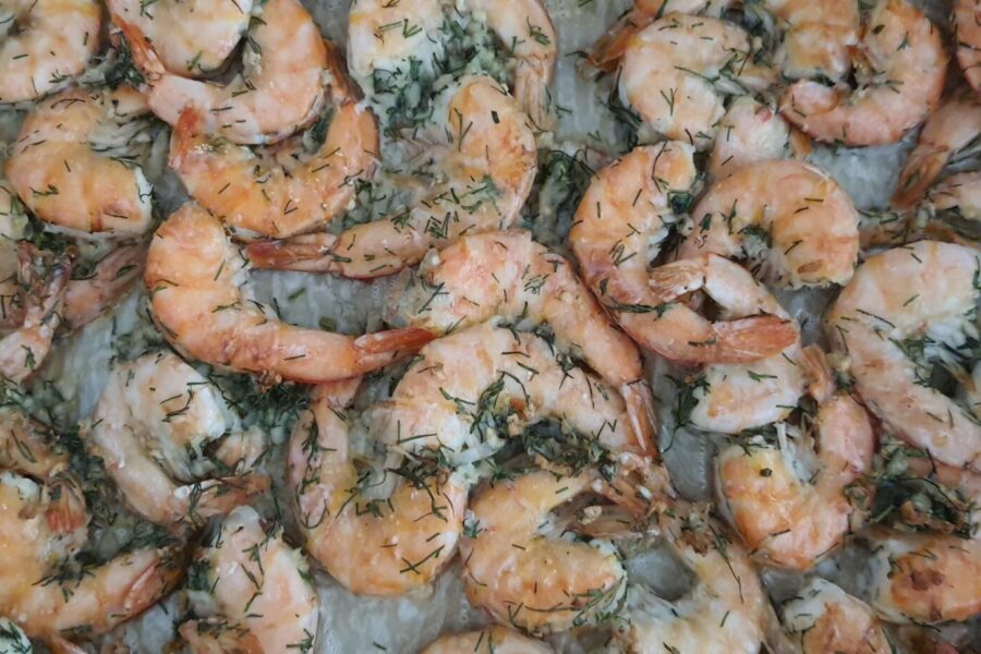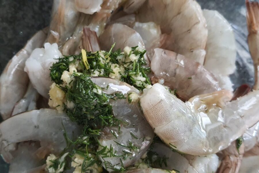 - Poner la mezcla de eneldo y ajo sobre las gambas, añadir 2 cucharadas de aceite de oliva y añadir sal.