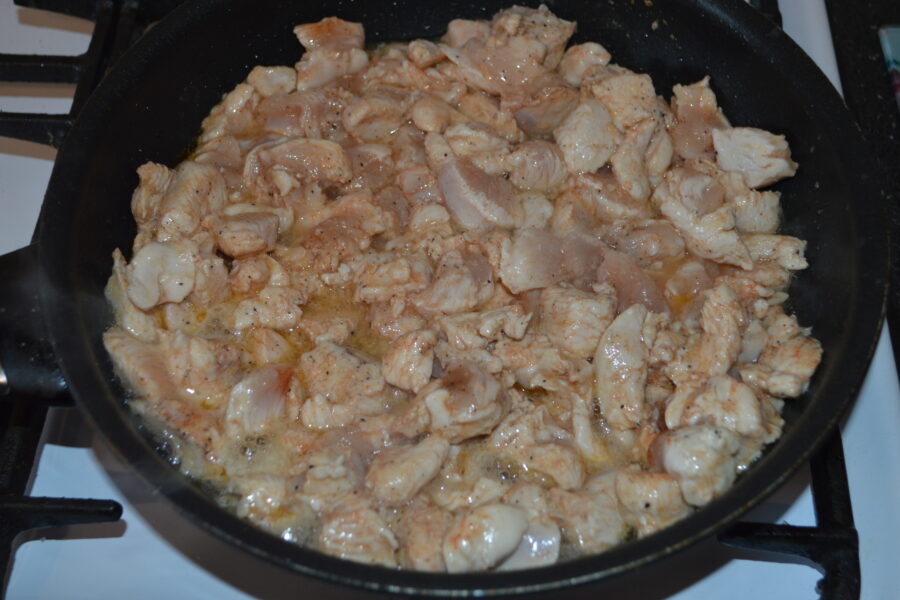 Cortar la pechuga en trozos pequeños ayuda a que se cocine rápido y quede tierna. Saltear el pollo a fuego bajo con pimentón, sal y pimienta permite que las especias se adhieran bien sin resecar la carne. Es importante no pasarse con el tiempo de cocción: cuando el pollo cambia de color por completo y está firme, ya está listo para el relleno.