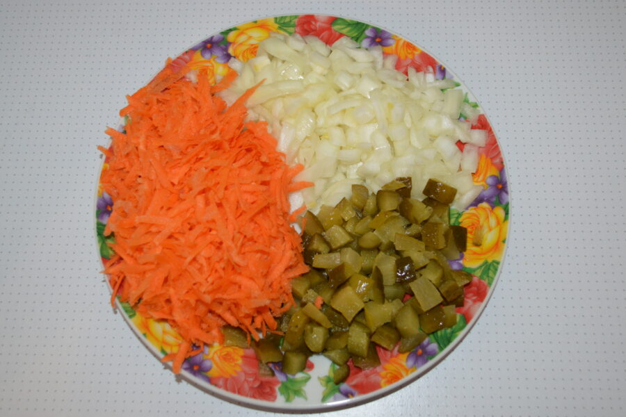 - Ralla la zanahoria con un rallador grueso y pica finamente la cebolla y los pepinillos.
