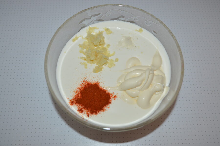 - Para preparar la salsa: en un bol pon la crema agria junto con la mayonesa, el ajo prensado, la sal y el pimentón. Mezcla bien con una cuchara.