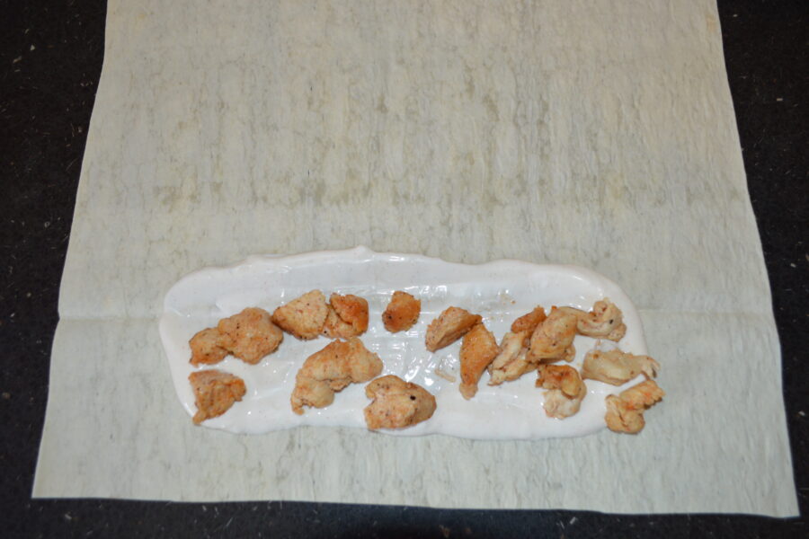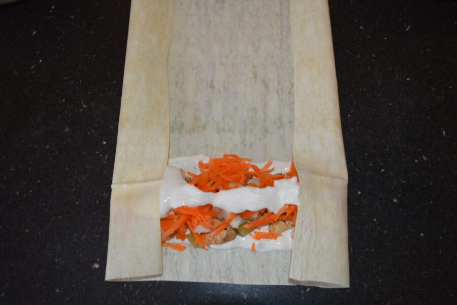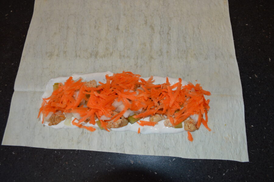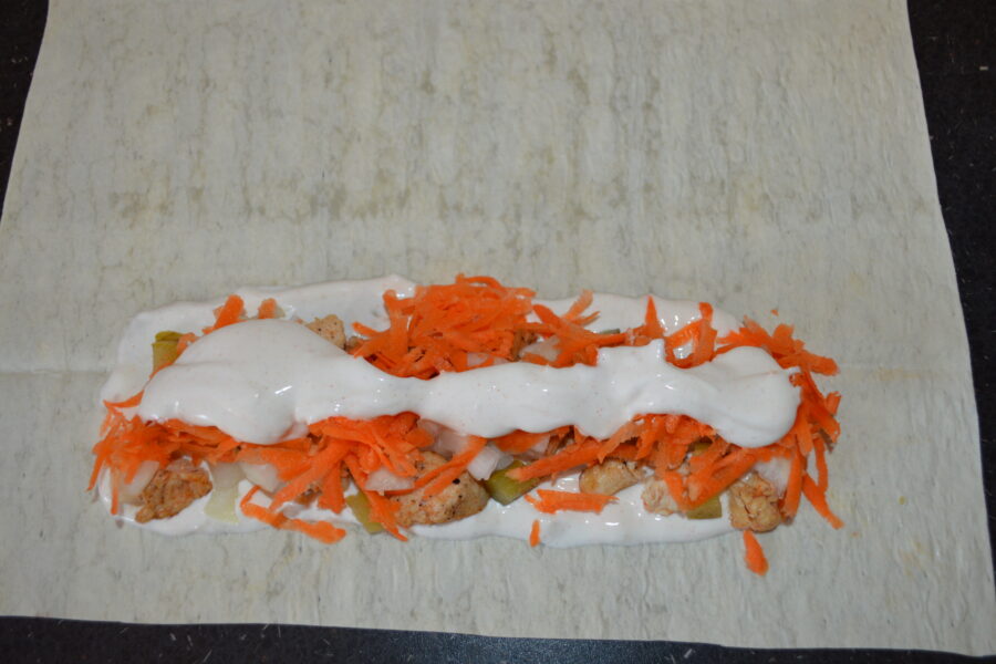 - Coloca una cucharada de salsa sobre el lavash y, encima, añade el pollo.