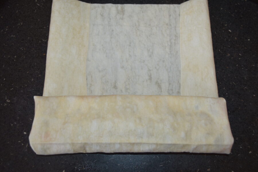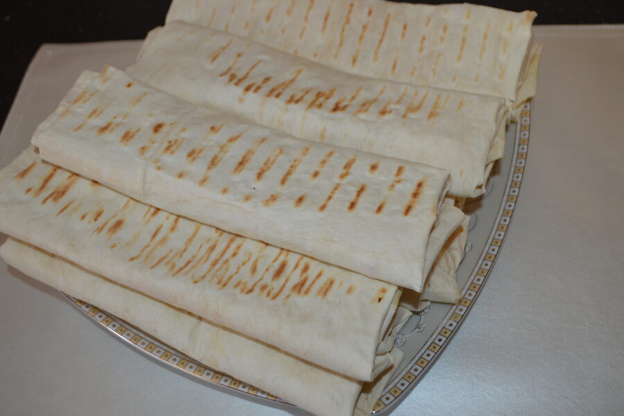 - Corta el lavash en trozos iguales; en un paquete suele haber 2 láminas largas de lavash que se dividen en 3 partes cada una, de modo que de un paquete obtienes 6 trozos.