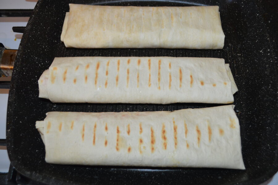 Dorar el kebab en una sartén grill sin aceite adicional permite que el lavash quede crujiente por fuera, manteniendo el interior jugoso. Cocinarlo a fuego bajo 2–3 minutos por cada lado evita que se queme y da tiempo a que se caliente el relleno. Las marcas de la parrilla también mejoran la presentación y lo acercan al estilo de los locales de kebab.