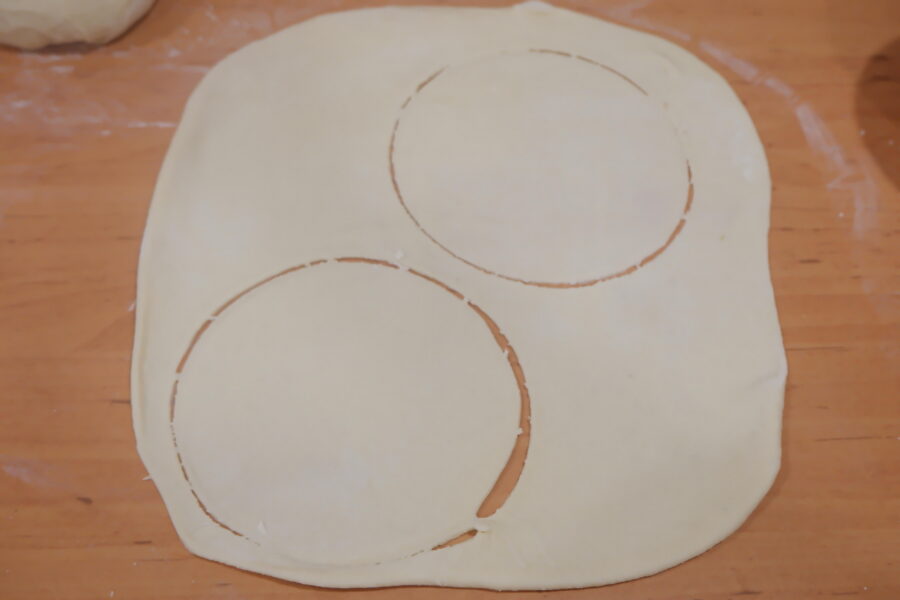 - Corta círculos de masa; el mío tiene 9 cm de diámetro. Coloca el relleno en el centro de cada círculo y junta cuidadosamente los bordes; si la masa no se pega bien, puedes humedecer ligeramente los dedos con agua.