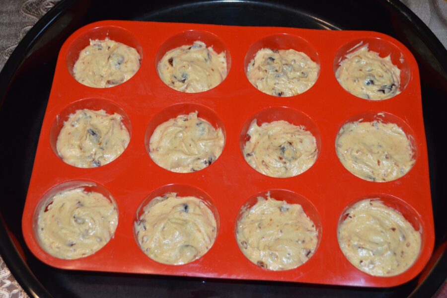 - Unta el molde para magdalenas con mantequilla derretida usando una brocha de cocina y colócalo sobre una bandeja plana de horno. Reparte la masa con una cuchara, llenando cada hueco solo hasta 2/3 de su capacidad, porque las magdalenas crecerán al hornearse. Con estas cantidades salen unas 17 magdalenas.
