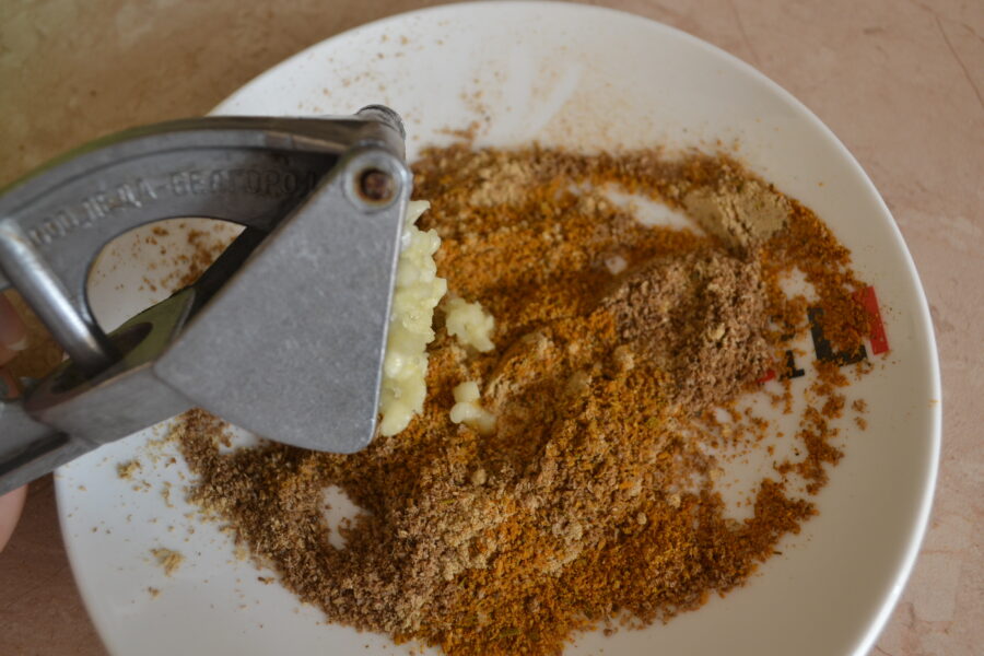 - Pela y pica el ajo. Puedes usar un rallador fino o un prensador de ajos. Algunas personas prefieren picarlo muy pequeño o aplastarlo con la hoja del cuchillo. Añade el ajo a la mezcla de especias y remueve.
