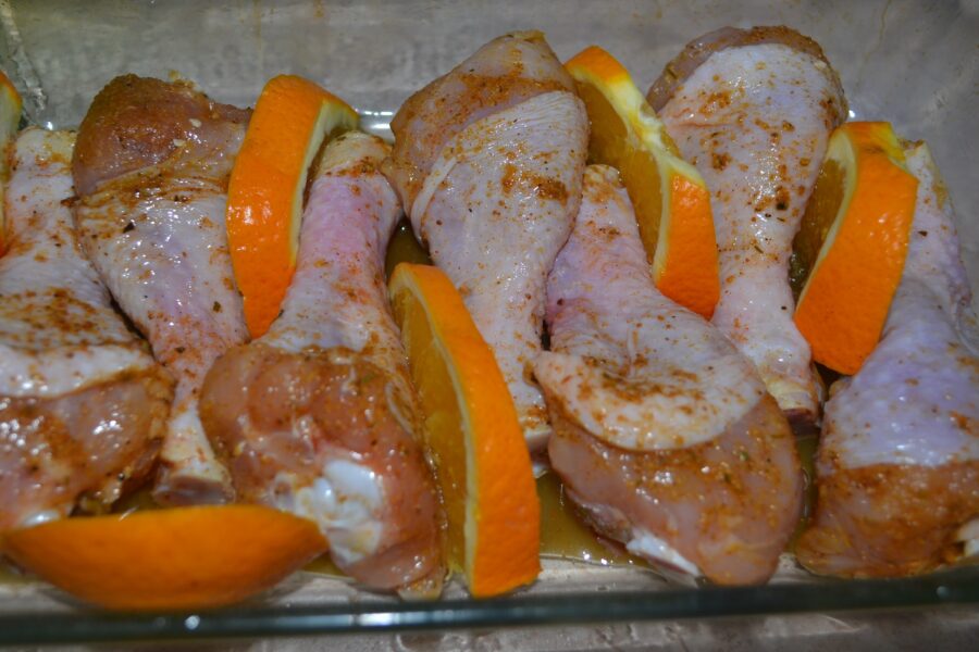 - Algunas personas añaden una pequeña cantidad de miel para conseguir una corteza más crujiente. Corta la naranja en 2 mitades. Exprime el zumo de una mitad sobre los muslos marinados. Mezcla todo bien y deja marinar aproximadamente 30 minutos.