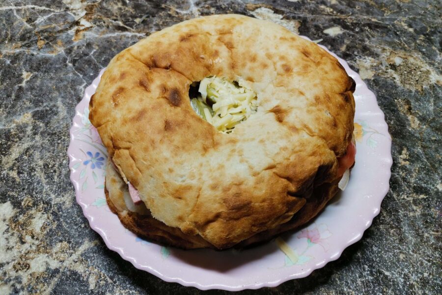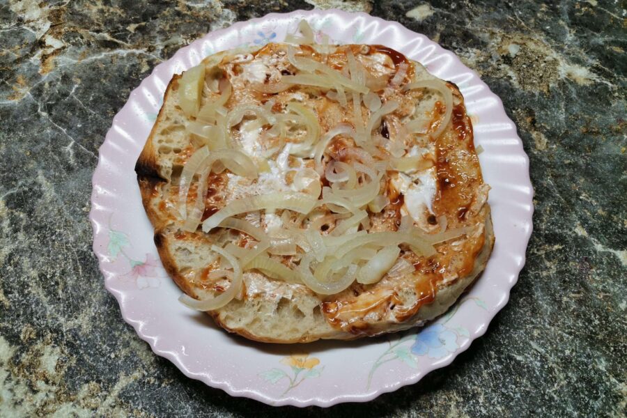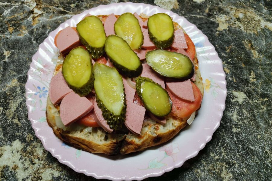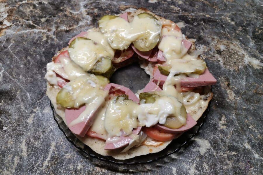 La pizza sobre pan de pita es una solución perfecta cuando quieres algo con sabor a pizza pero no tienes tiempo para preparar la masa. El pan lavash actúa como base fina y se cubre con una mezcla sencilla de salchichas cocidas, pepinillos encurtidos, tomate, cebolla marinada y queso. Solo hay que montar las capas, cubrir con otra mitad de lavash o dejarla abierta y hornear unos minutos. El resultado es una pizza muy rápida, con contraste de sabores y una textura agradablemente tierna y jugosa.