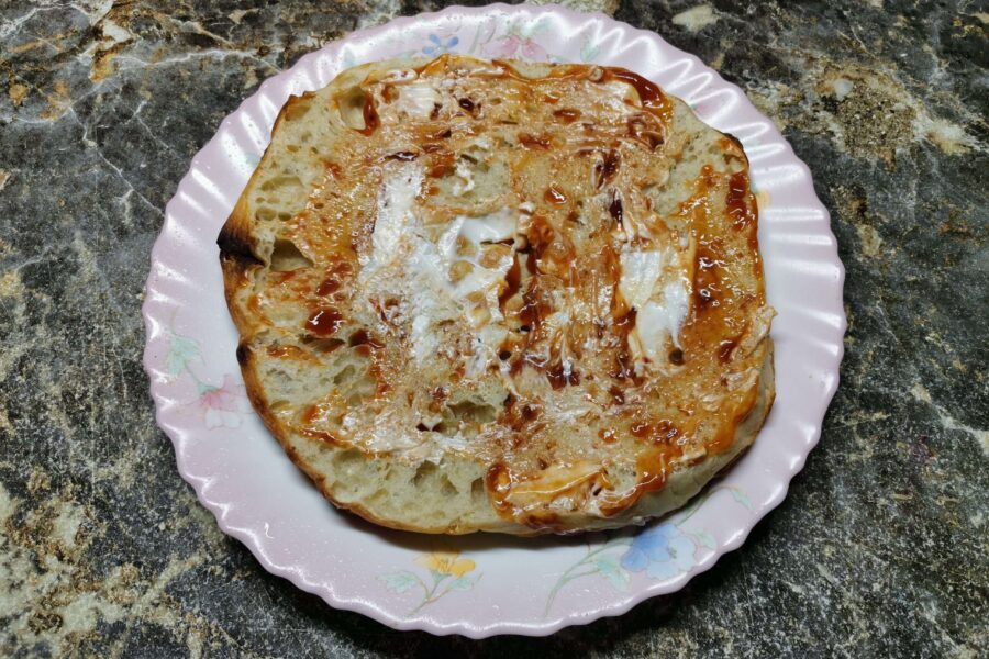 Al ser una base muy fina, el pan de pita necesita solo unos minutos en el horno precalentado. En 5–7 minutos el queso se funde y la superficie se dora ligeramente. Es importante no excederse demasiado en el tiempo para que el lavash no quede excesivamente seco o duro.