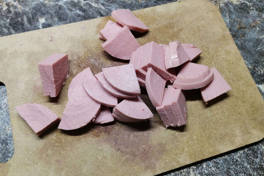 - Corta las salchichas cocidas y los pepinillos encurtidos.
