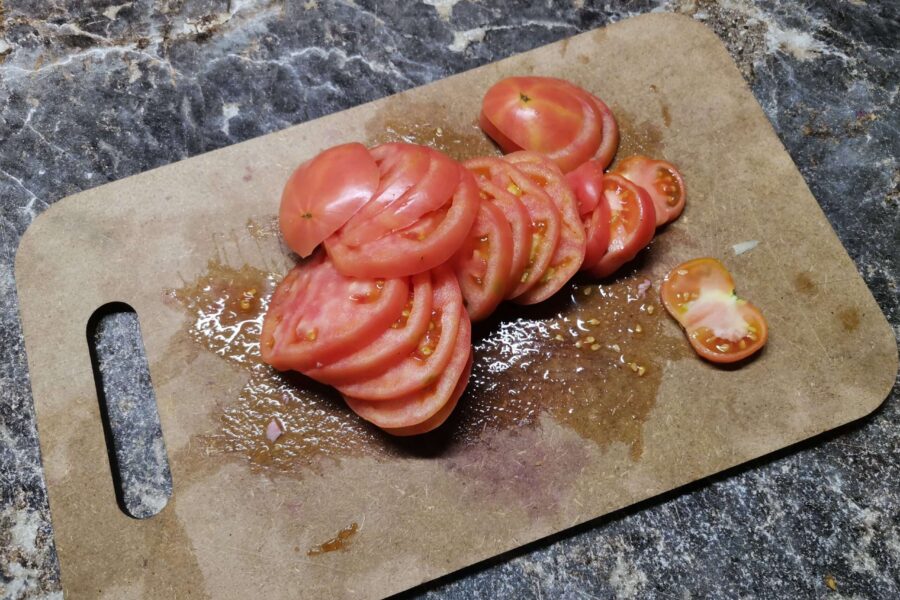 El tomate fresco da jugosidad y dulzor, mientras que el pepinillo encurtido aporta acidez y un toque crujiente. La combinación con salchichas cocidas crea un contraste muy apetecible. Este juego de sabores hace que, aunque la receta sea sencilla, el resultado no se sienta monótono.