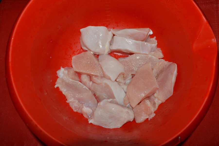 - Lavar la pechuga de pollo y cortarla en trozos grandes.