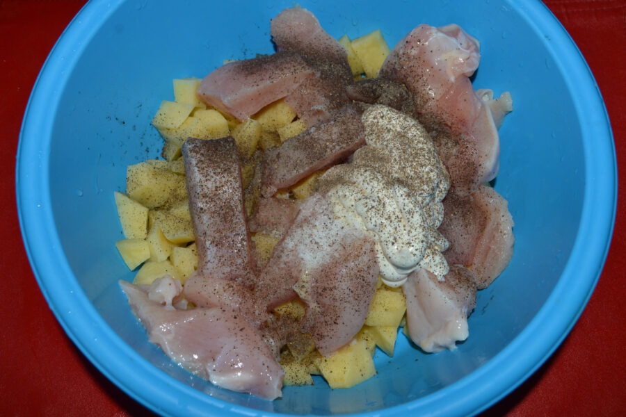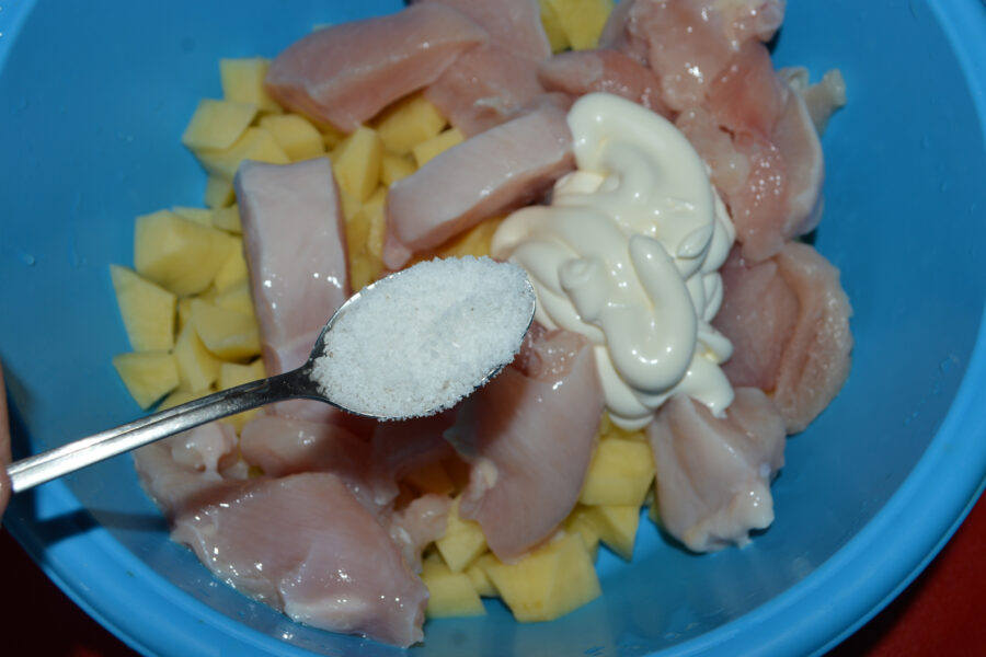 - Pasar la pechuga de pollo al bol con las patatas y añadir la mayonesa.