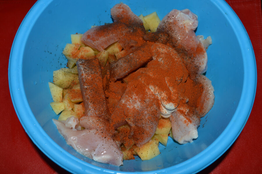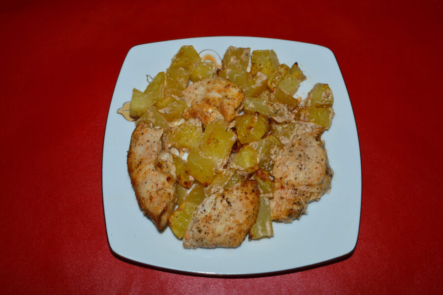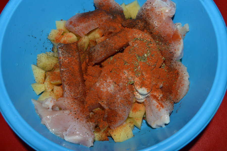 Las patatas se pelan, se lavan y se cortan en cubos de tamaño similar para que se horneen de forma uniforme. La pechuga de pollo se corta en trozos grandes, lo que ayuda a que no se seque demasiado en el horno y quede jugosa por dentro.