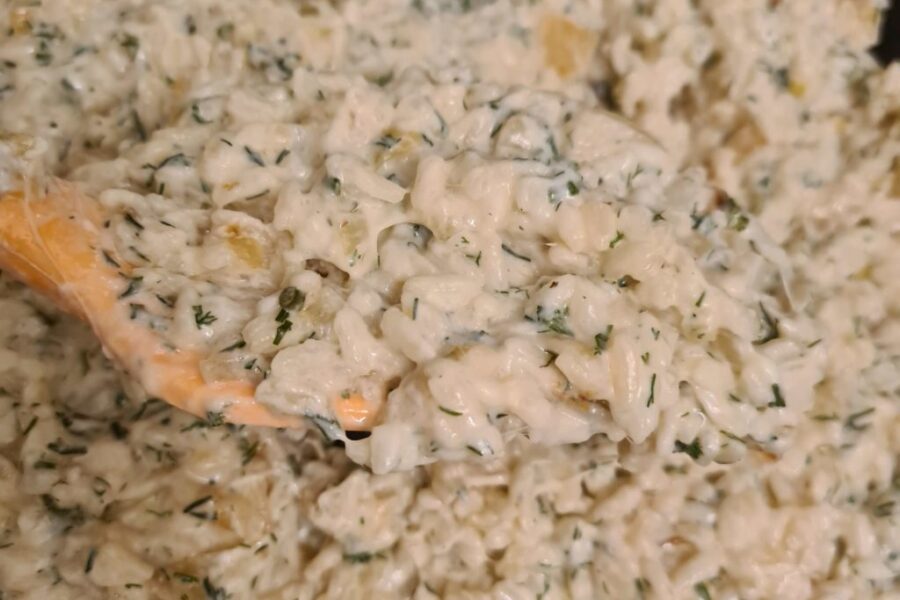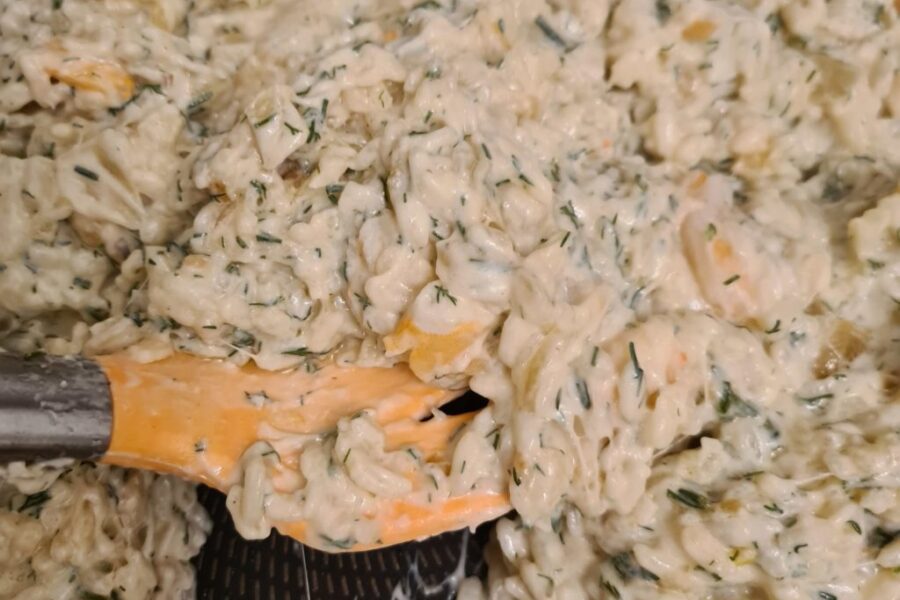 Este risotto de camarones con mozzarella es un plato refinado pero fácil de preparar, pensado para quienes quieren cocinar algo especial sin complicarse. La cremosidad del arroz se consigue con crema para salsas al 20%, mantequilla y queso rallado, mientras que los camarones, el ajo y el eneldo fresco aportan un aroma intenso y muy agradable. El arroz se cocina poco a poco con agua caliente hasta quedar ligeramente firme en el centro, como debe ser un buen risotto. Con estas cantidades obtienes dos raciones perfectas para una cena casera con sabor mediterráneo.