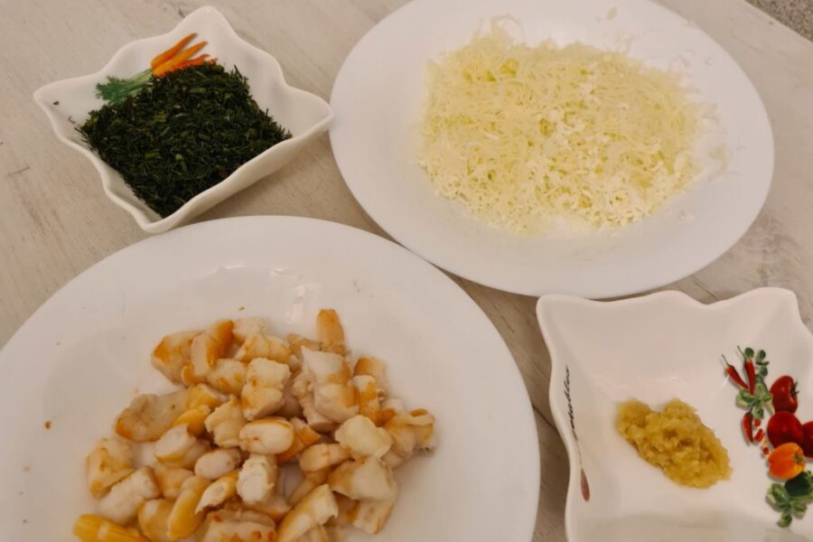 - Mientras la humedad se evapora, hay que preparar los demás ingredientes. Hay que picar finamente las hierbas, limpiar los camarones de la cáscara y las vísceras, rallar el queso en un rallador fino, pelar y rallar el ajo.