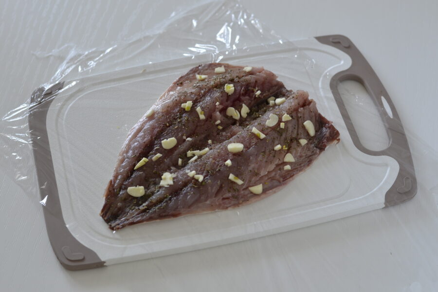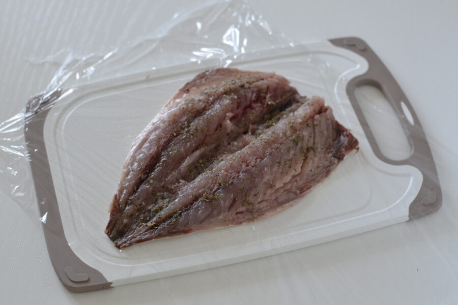 - Colocar los filetes de caballa sobre un trozo de film alimentario, salar y espolvorear con pimienta molida y hierbas caucásicas al gusto.