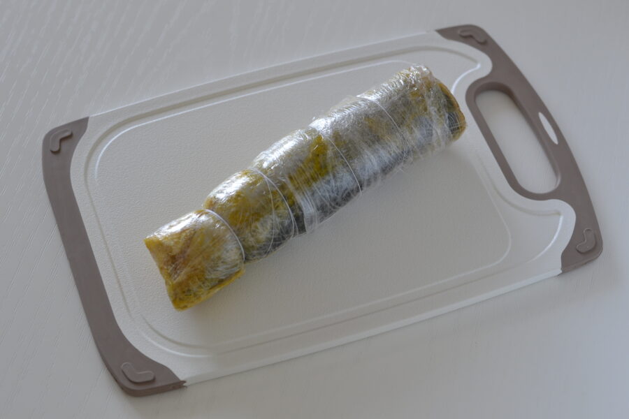 - Enrollar con cuidado el filete de caballa y envolverlo bien en el film alimentario.