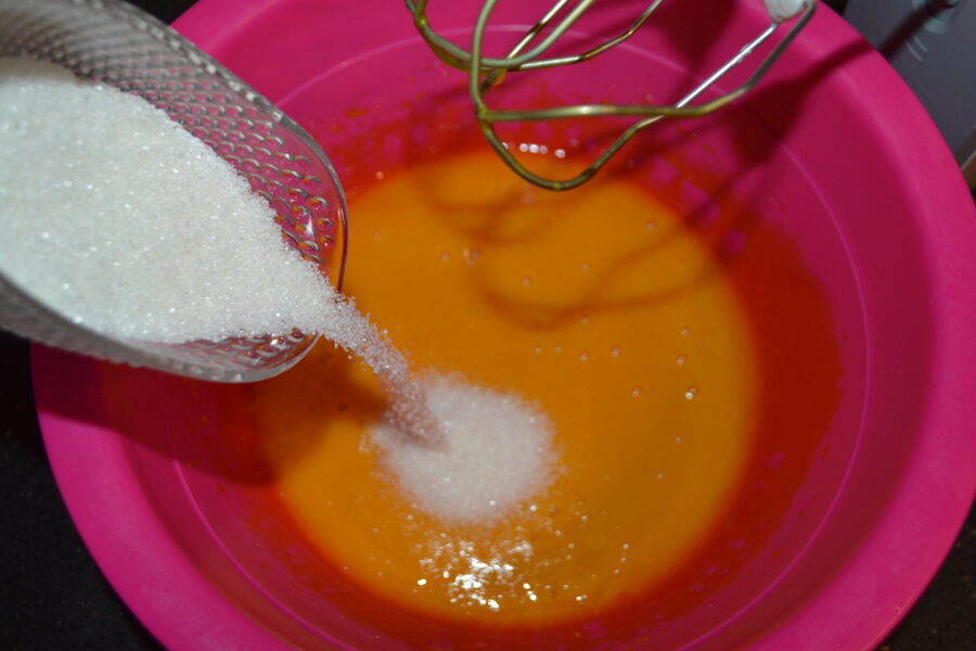 - Bate las yemas con la batidora e incorpora los otros 60 g de azúcar.