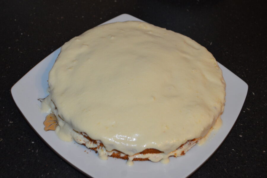 - Procede igual con las tres capas y, al final, cubre también los laterales del pastel con crema.