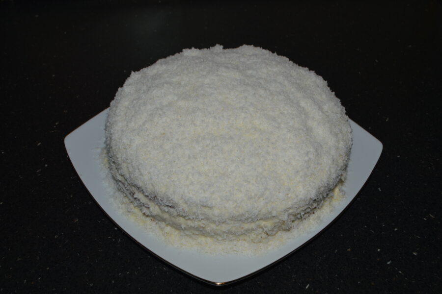 - Espolvorea coco rallado por la superficie y los laterales de la tarta.