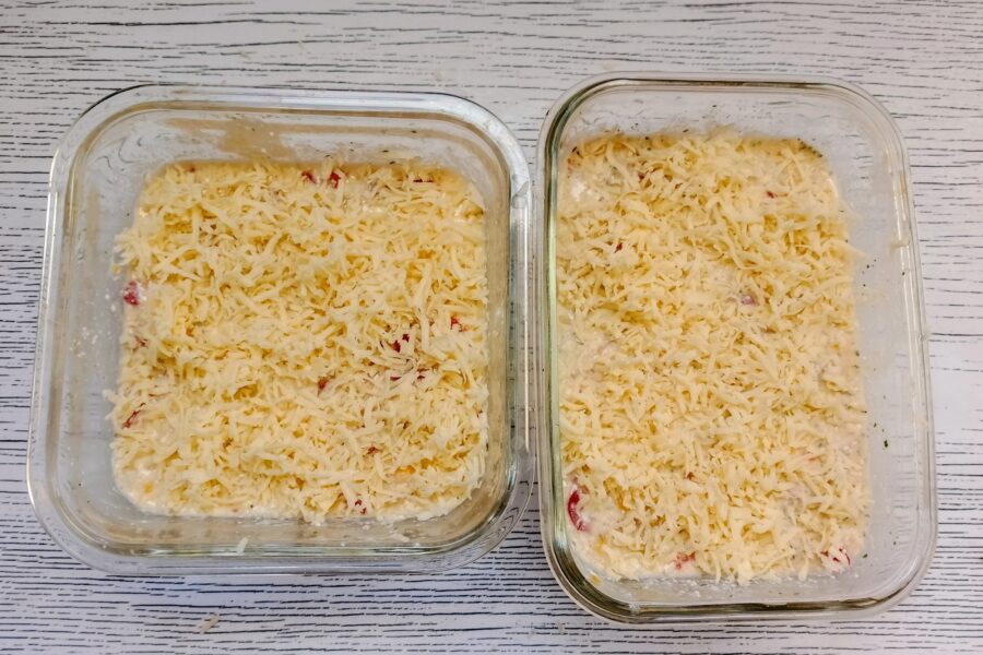 - Añadir el queso rallado con un rallador de agujero grueso. Llevar la omleta al horno a 180 °C durante 30 minutos.