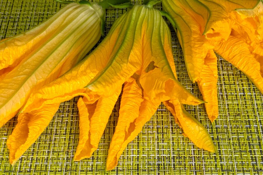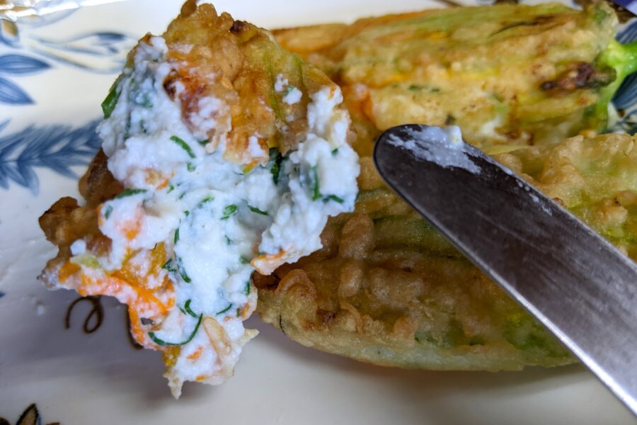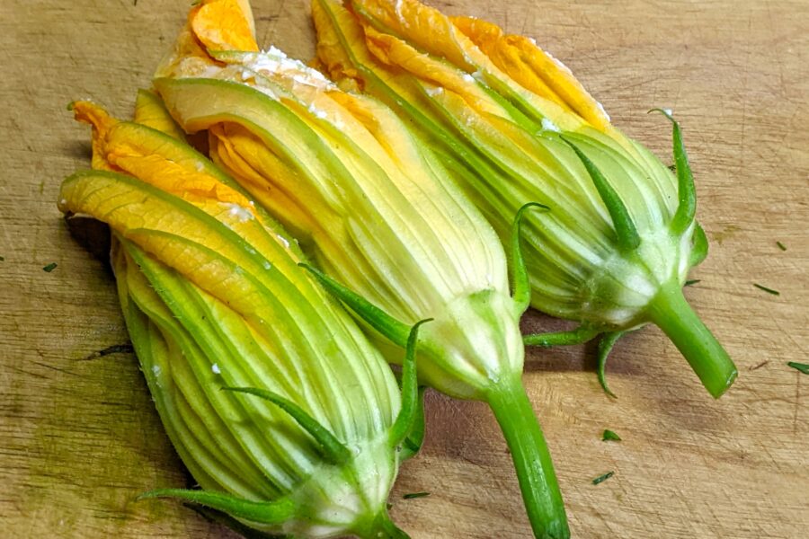 Reteta de flori de dovlecei umplute cu cascaval ricotta, verdeturi si usturoi.