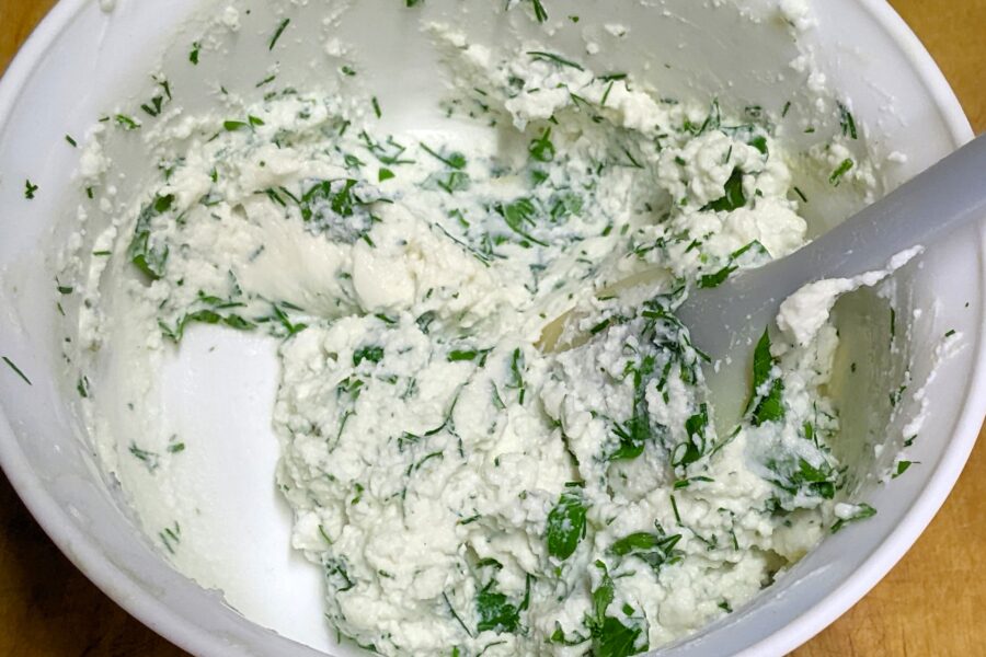- Amestecati cascavalul ricotta, mararul, patrunjelul si usturoiul.