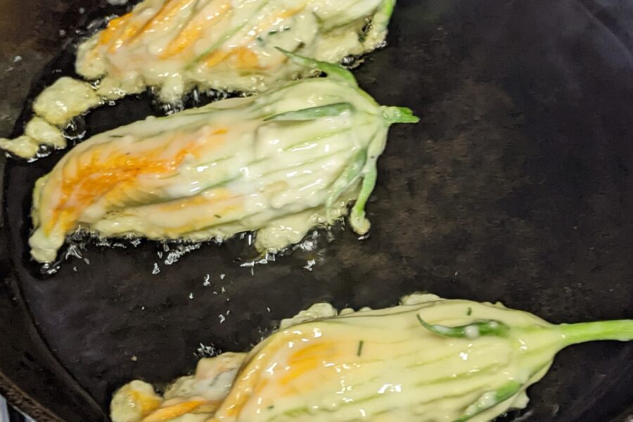 - Amestecati toate ingredientele pentru aluat si inmuiati florile umplute in aluat.