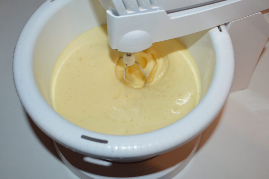 - Ajoutez progressivement la farine et battez continuellement avec le batteur à faible vitesse.