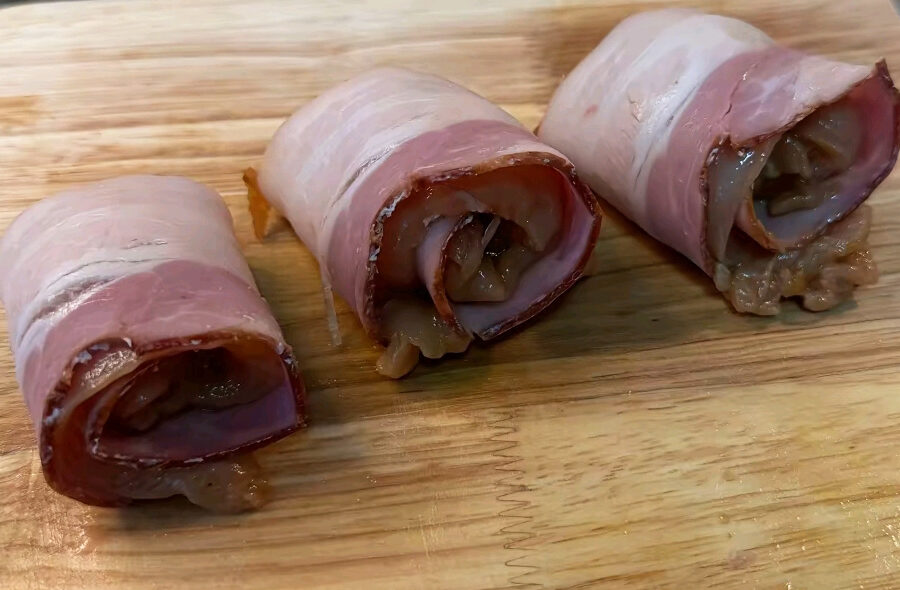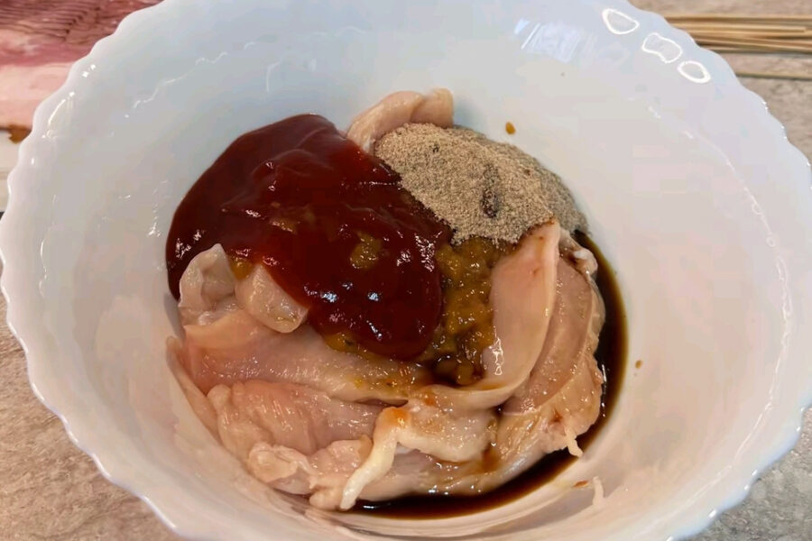 - Dupa ce pieptul de pui s-a marinat, il intindeti pe bacon.