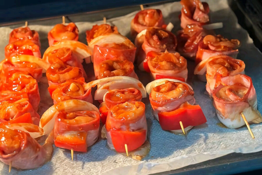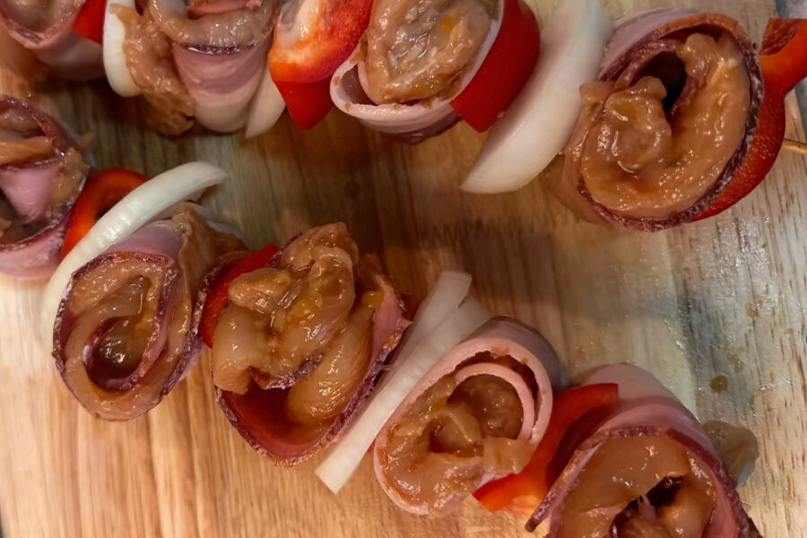 - Infigeti in tepuse pentru frigarui rulourile cu carne si bacon, apoi ardei dulce taiat in bucati de marime medie, apoi iarasi rulou, apoi rondele taiate din ceapa. Faceti acelasi lucru pana le puneti pe toate pe tepuse.