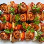 - Se ruleaza fiecare felie intr-un rulou. Baconul va ramane in interior. Apoi, rulourile de carne trebuie infipte pe doua tepuse, pentru a se mentine mai bine. Se aseaza pe gratar sau intr-o tava de copt, astfel incat carnea sa fie agatata. Se coace la cuptor aproximativ 30 de minute (la o temperatura de 180°C).