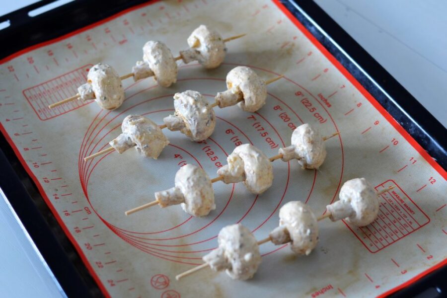 - Puneti o covorașă de silicon sau hârtie de copt pe o foaie de copt. Înșirăm ciupercile pe frigărui, câte 3 bucăți, apoi le așezăm pe o tavă de copt. Gătiți frigaruile în cuptorul preîncălzit pentru aproximativ 25 de minute la 180°C.