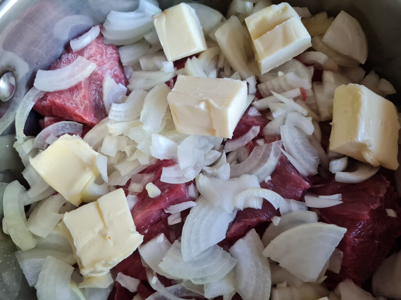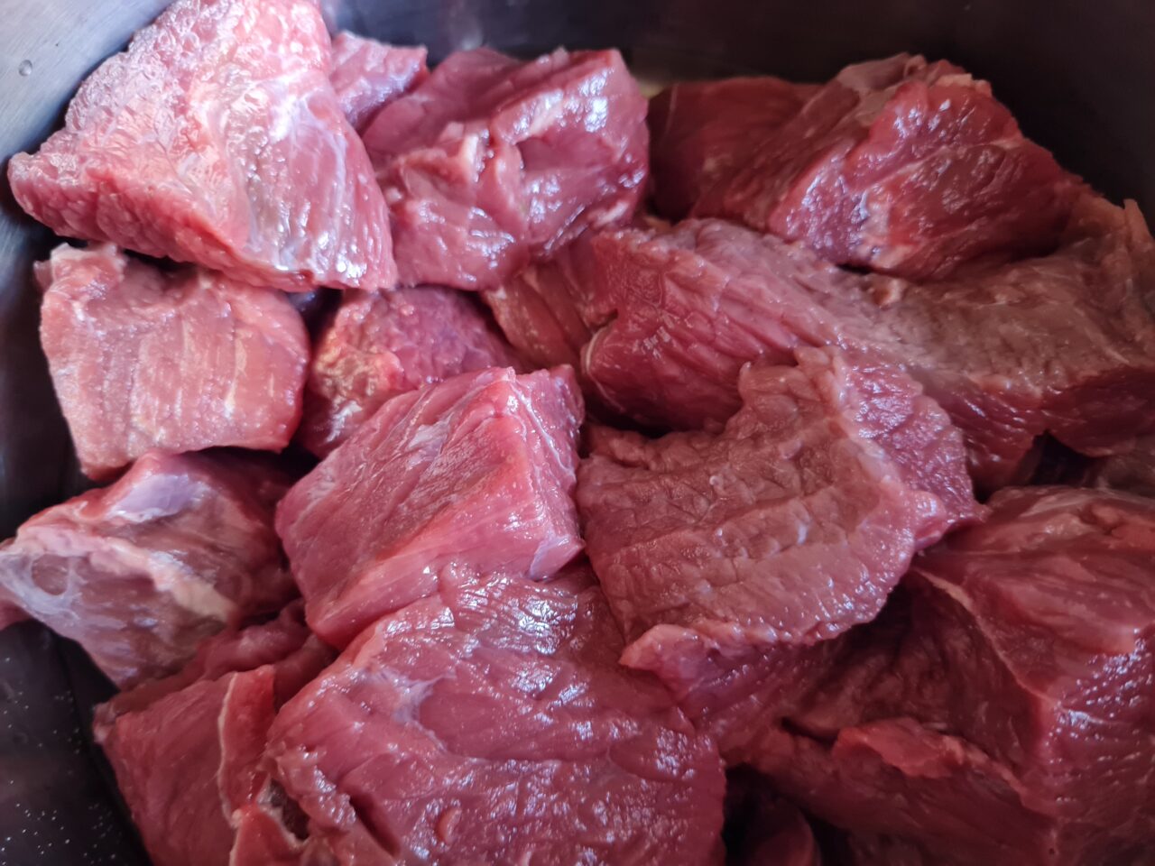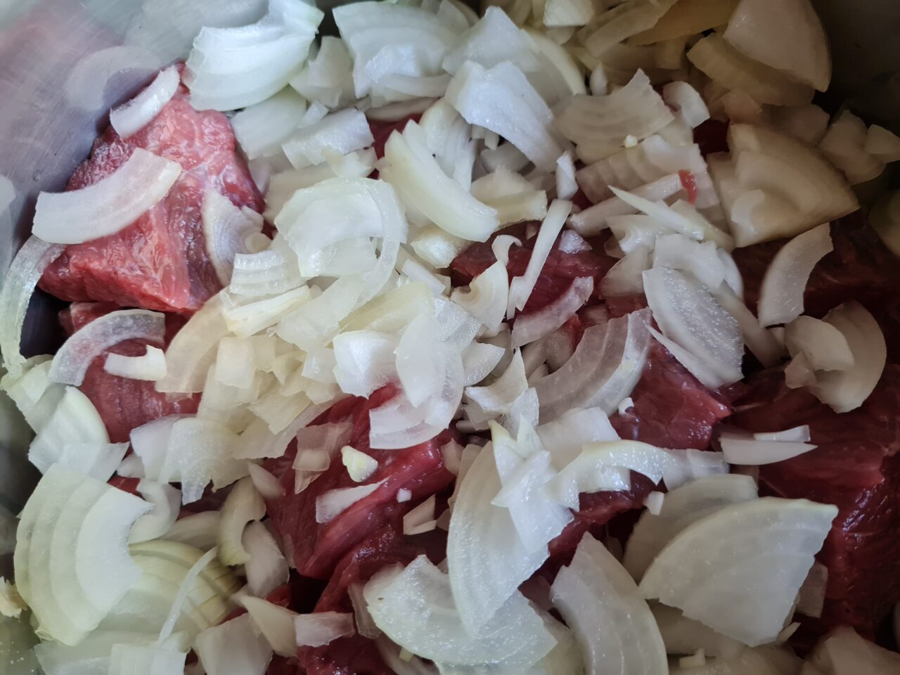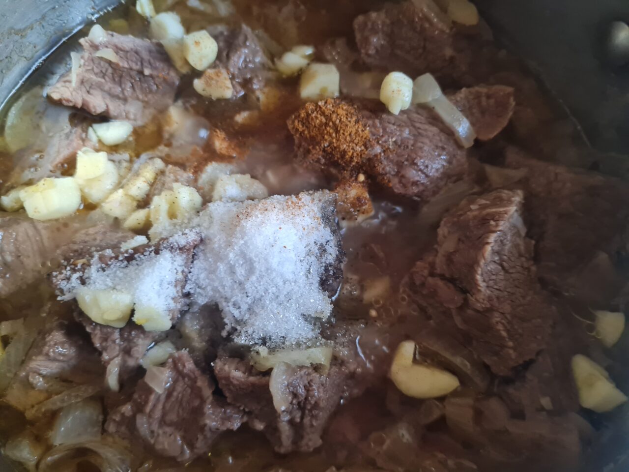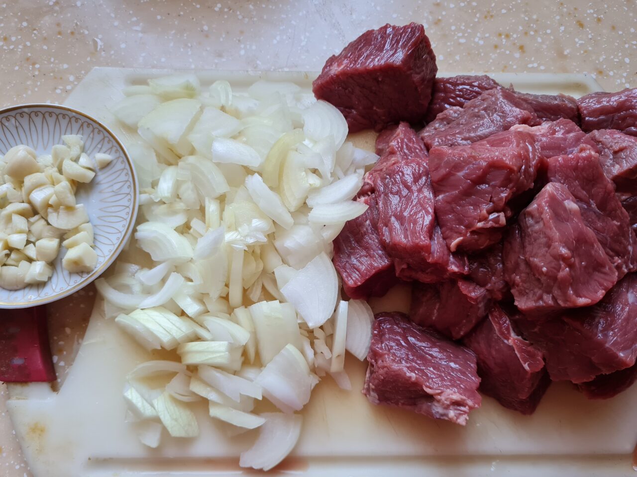 - Spalati carnea de vita si taiati-o in cuburi mari, apoi curatiti ceapa si usturoiul de coaja si taiati-le in orice mod doriti.