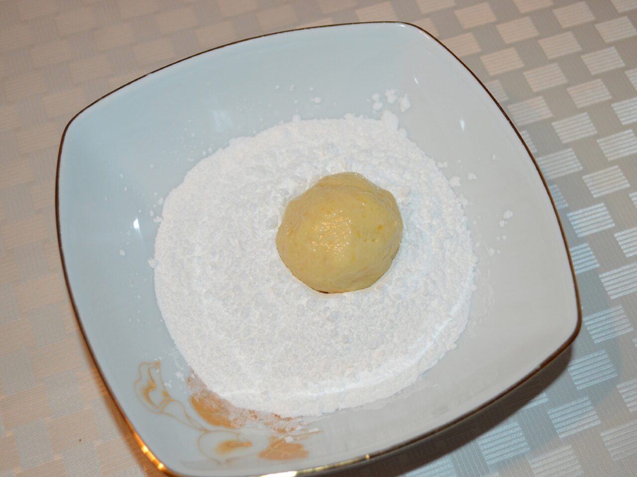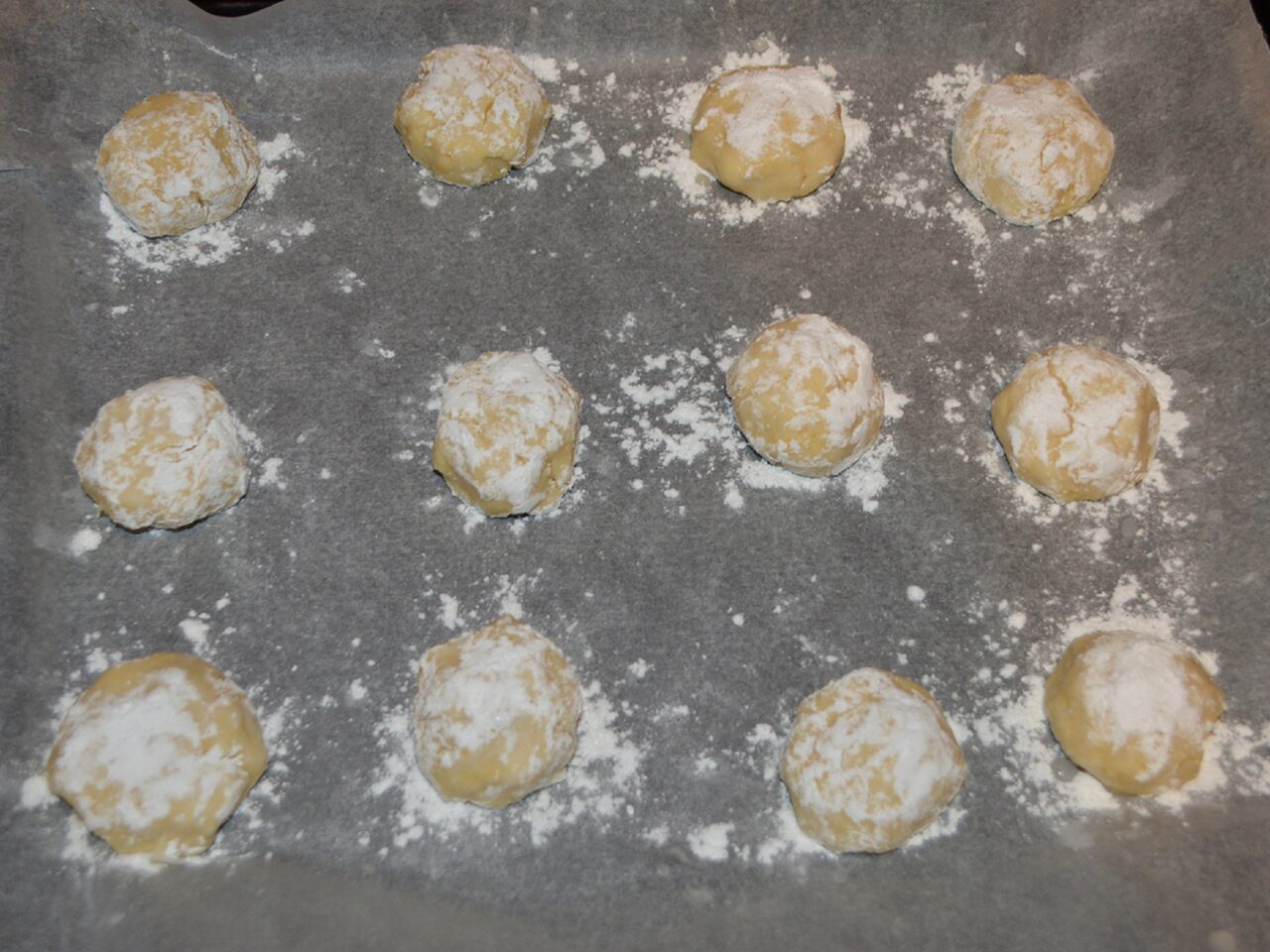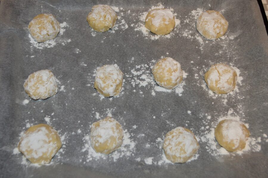 - Formati bilute din aluat cu mainele umede, si tavaliti-le prin zahar pudra.