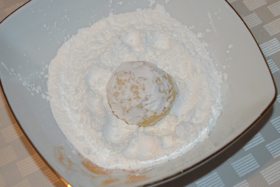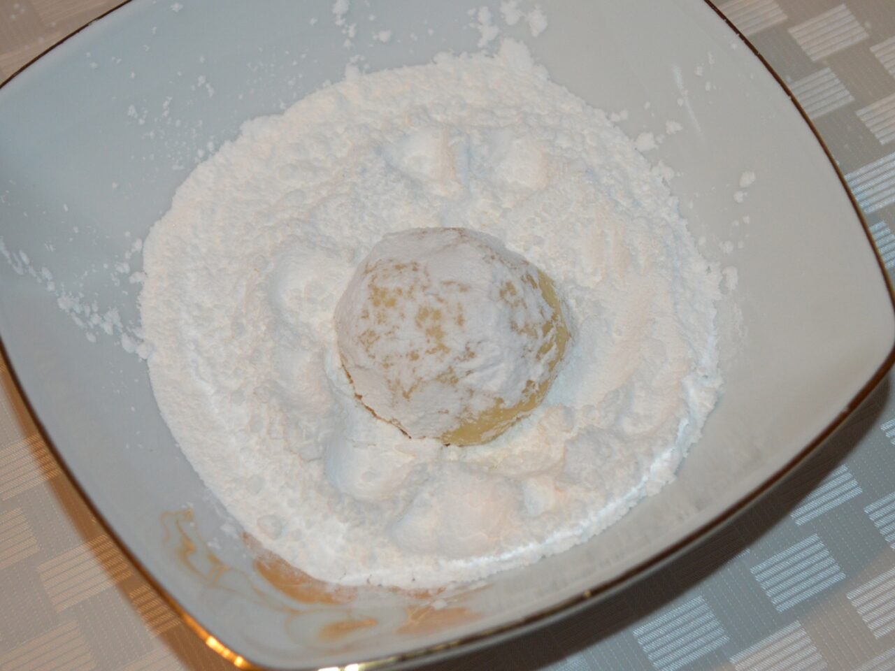 - Rostogoliti bilutele prin zahar pudra astfel incat sa fie acoperite din belsug pe toate partile.