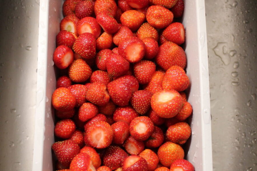 - Se culeg căpșunile și se îndepărtează tulpinile. Puneți fructele decojite într-o strecurătoare, clătiți-le, apoi acoperiți-le cu apă rece și lăsați-le în strecurătoare să se scurgă și să se usuce.