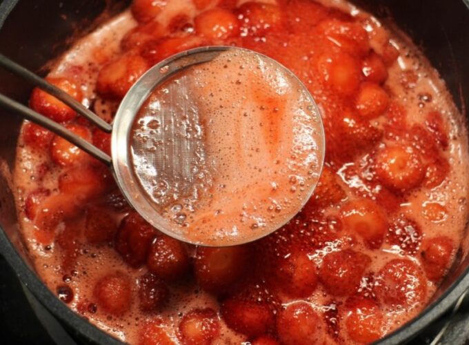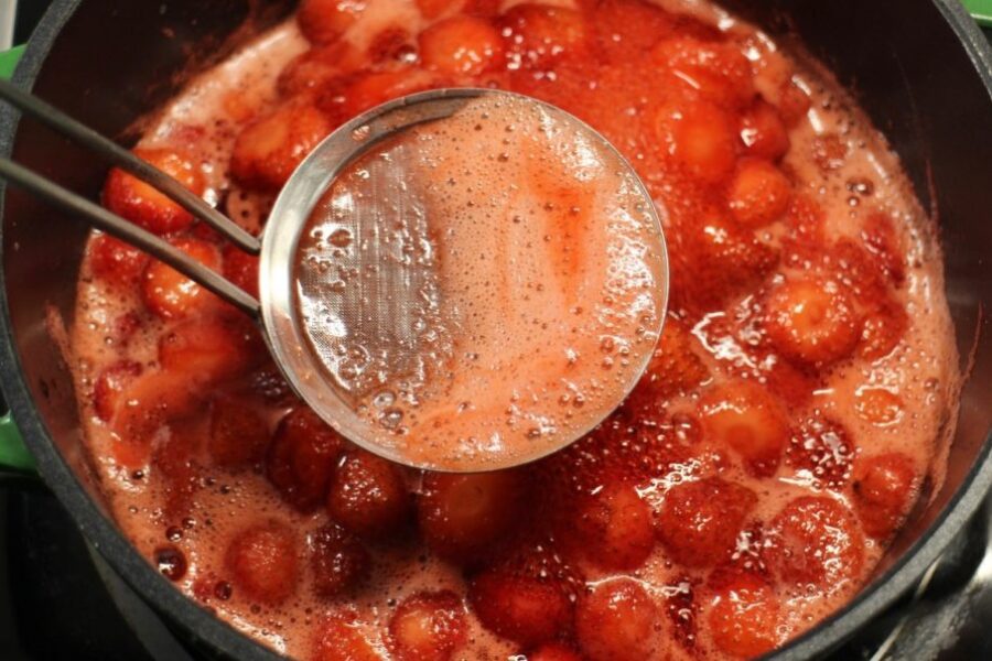 - După ce gemul fierbe, se îndepărtează spuma de la suprafață.