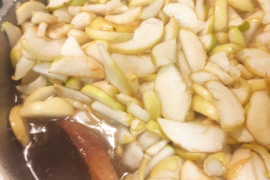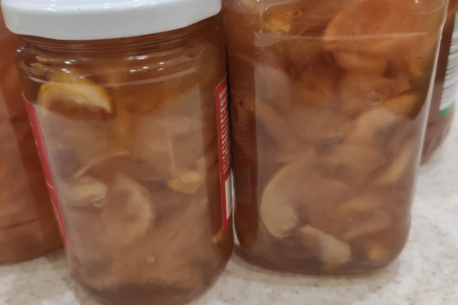 - Se ia de pe foc și se lasă merele să se răcească puțin și să se așeze pe fund. Se repetă procedura de 2-3 ori pe parcursul zilei, până când merele devin transparente și se distribuie uniform în sirop.
