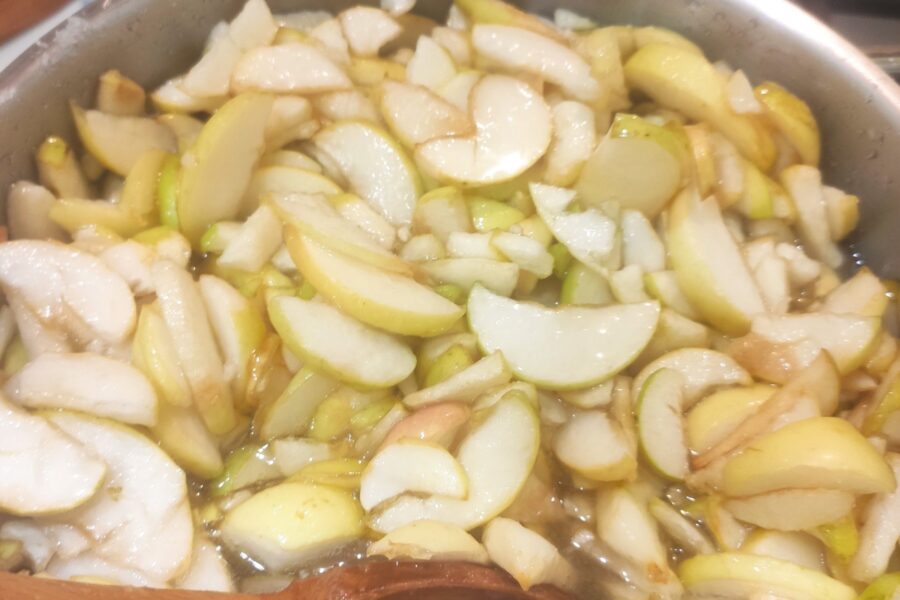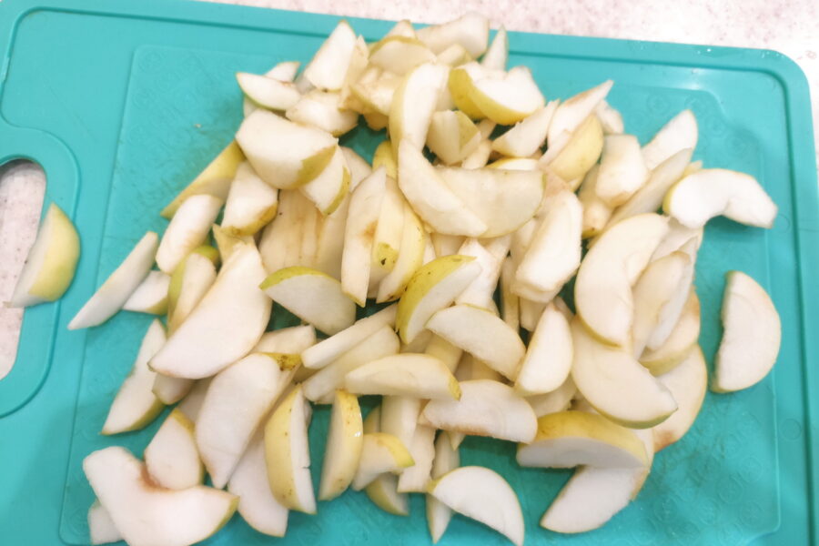 - Se taie merele pregătite în felii subțiri.