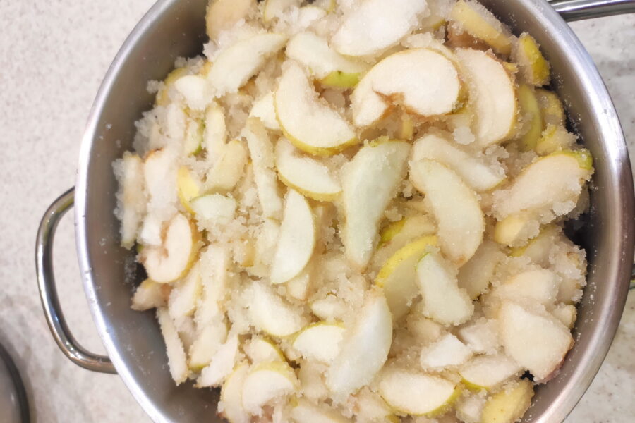 - Se adaugă zahărul, acidul citric și zahărul vanilat, se amestecă bine cu feliile de mere și se lasă la infuzat timp de 6-8 ore. În acest timp, merele trebuie să elibereze suc, iar zahărul să se dizolve parțial. Pentru a accelera procesul, se recomandă amestecarea periodică a compoziției de mere.