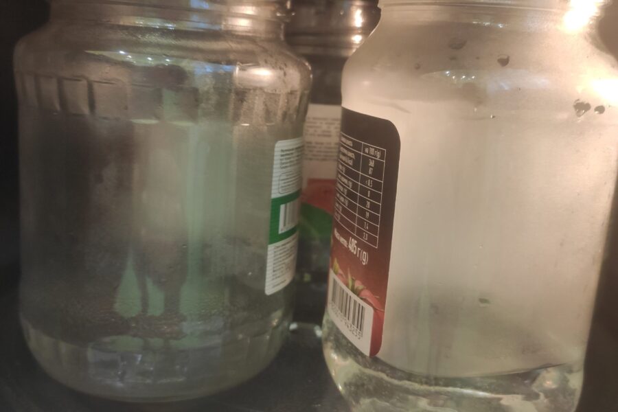 - Se pregătesc borcanele de sticlă și capacele pentru acestea. Se toarnă 1,5 cm de apă în borcane și se pun în cuptorul cu microunde timp de 5-7 minute. Capacele pot fi fierte în orice recipient pe aragaz timp de 2-3 minute.