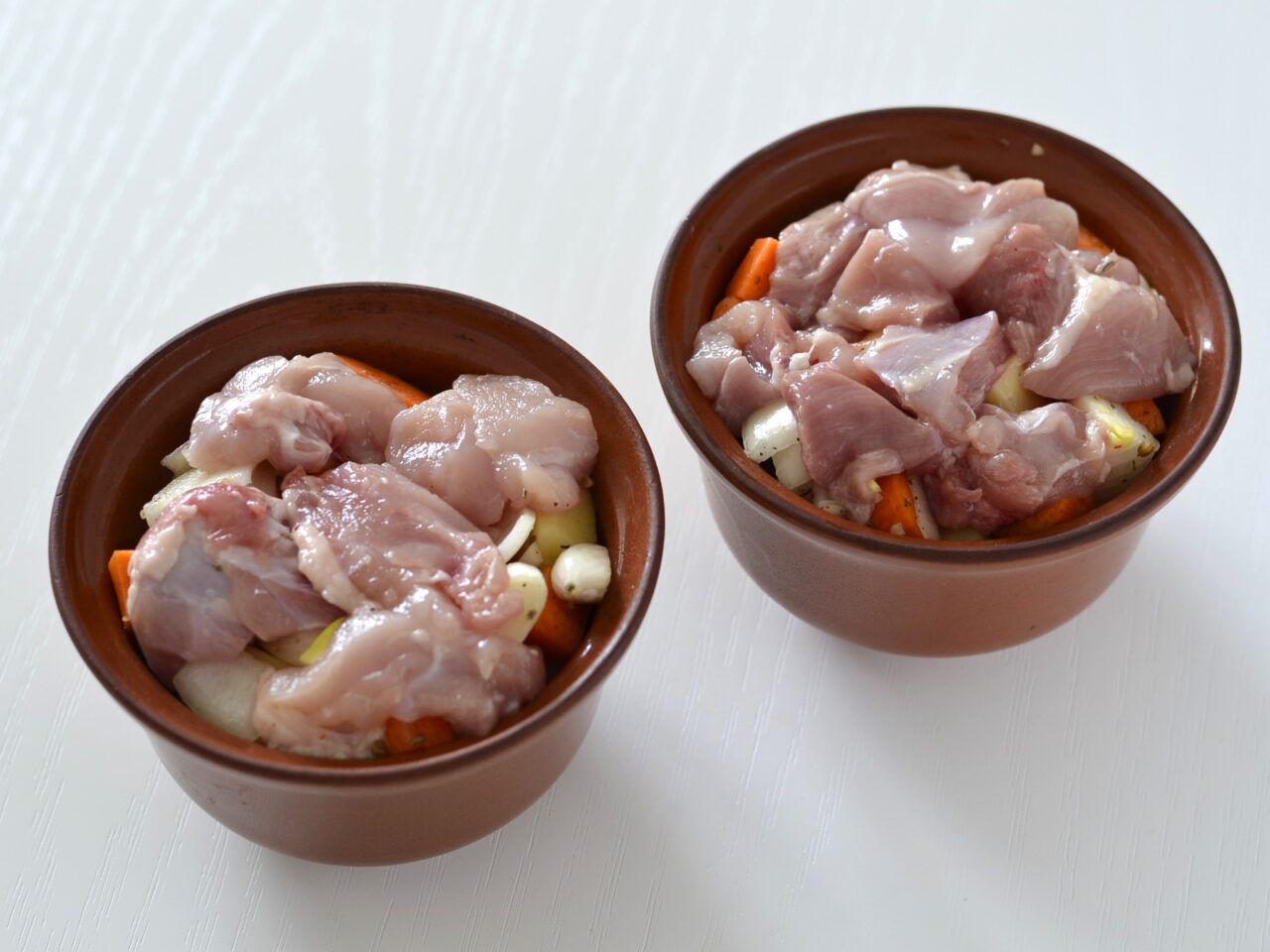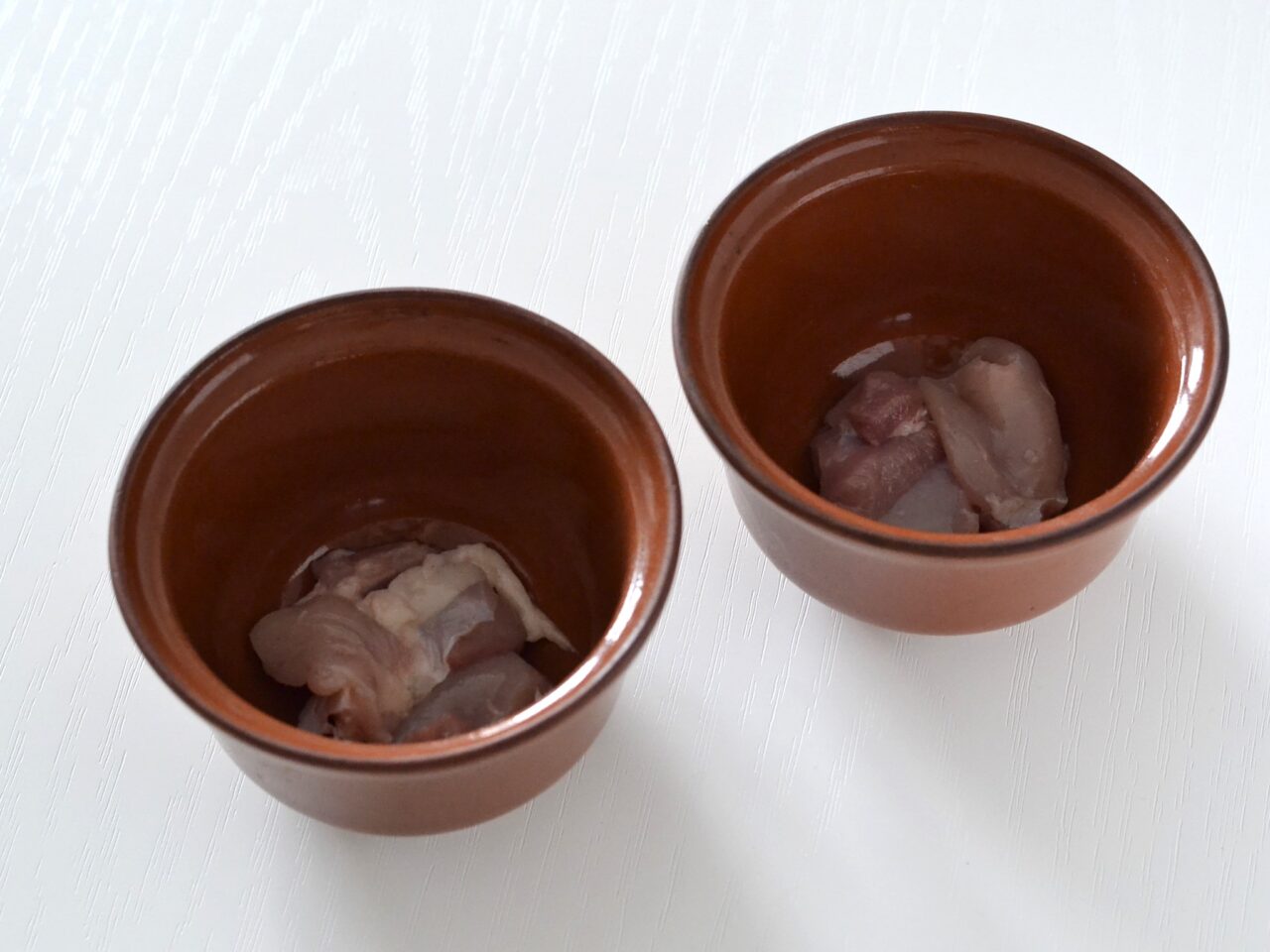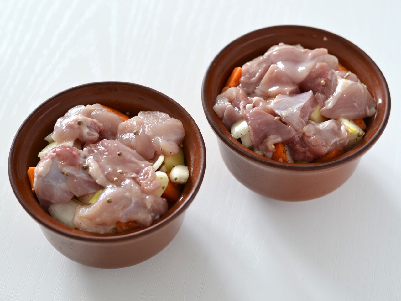 - Puneti cateva bucati de carne pe fundul ghivecelor si sarati putin.